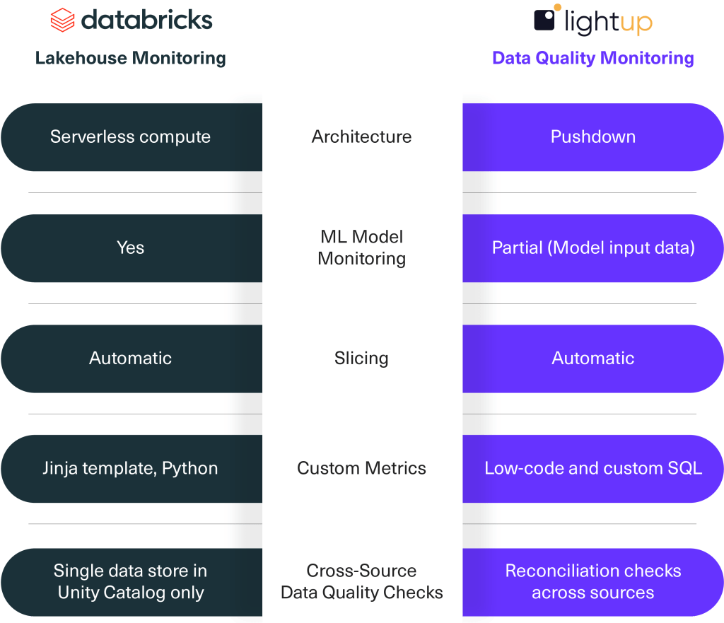 Now that we’ve walked through an overview of Lakehouse Monitoring, let’s see where Lightup fits in by comparing some notable features and functionalities.