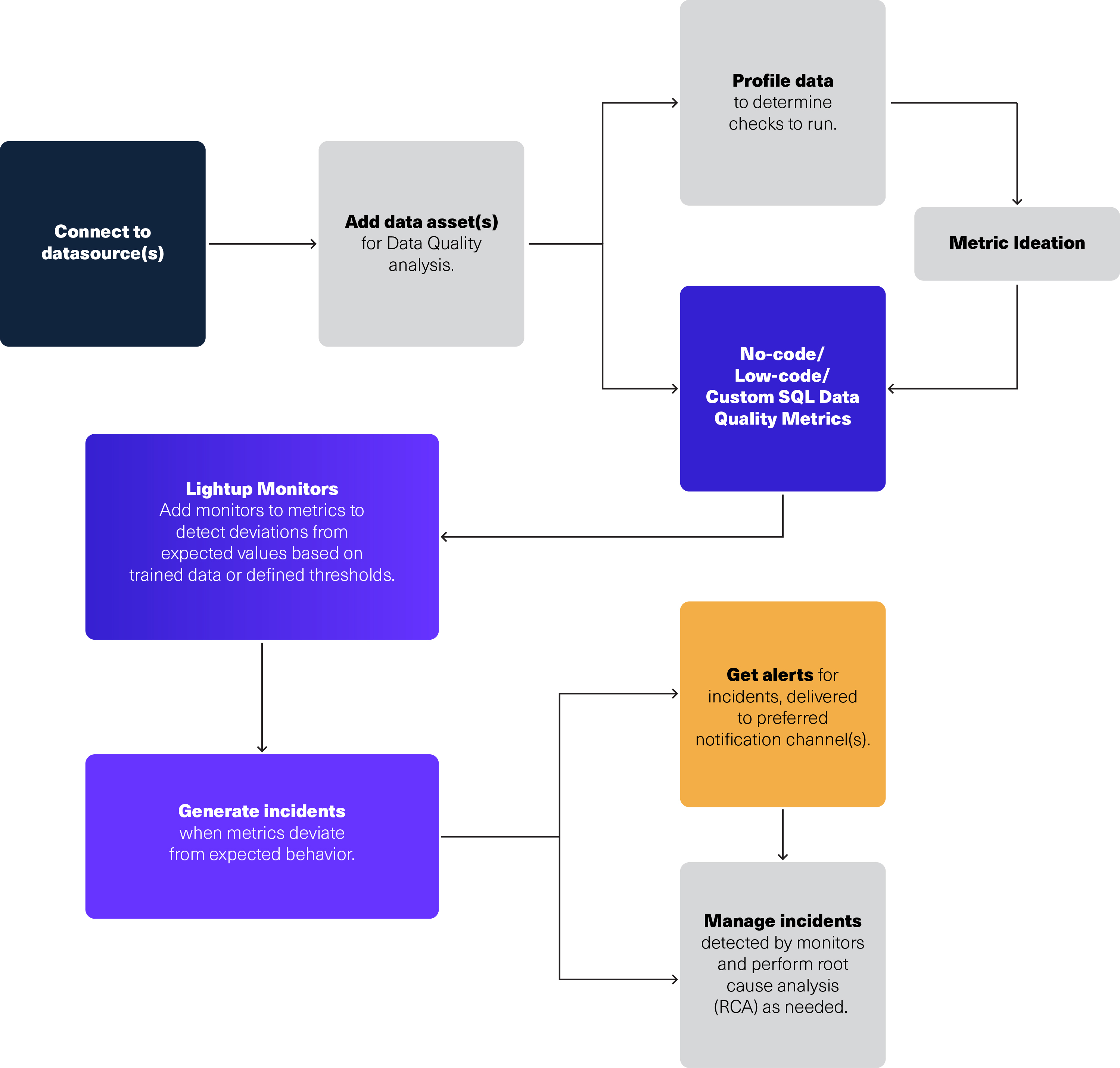 With user-friendly no-code/low-code Data Quality Checks, Lightup is compatible with diverse data sources and has a proven record for addressing complex, business-specific Data Quality challenges for large Fortune 500 enterprises. When you need to monitor enterprise data that combines Databricks and other data sources, Lightup provides comprehensive coverage with integrated AI-powered Anomaly Detection, Incident Alerts, and Remediation workflows that connect to your current processes across the data stack.